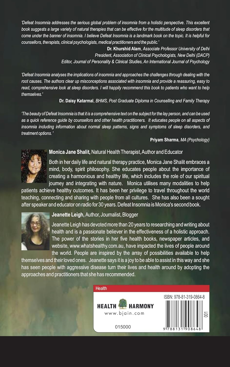 Monica Jane Shalit, Natural Health Therapist, Author andEducator Both in her daily life and natural therapy practice,Monica Jane Shalit embraces a mind, body, spirit philosophy. Sheeducates people about the importance of creating a harmonious andhealthy life, which includes the role of our spiritual journey andintegrating with nature. Monica utilises many modalities to helppatients achieve healthy outcomes. It has been her privilege totravel throughout the world teaching, connecting and sharing withpeople from all cultures. She has also been a sought after speakerand educator on radio for 30 years. Defeat Insomnia is Monicassecond book.
