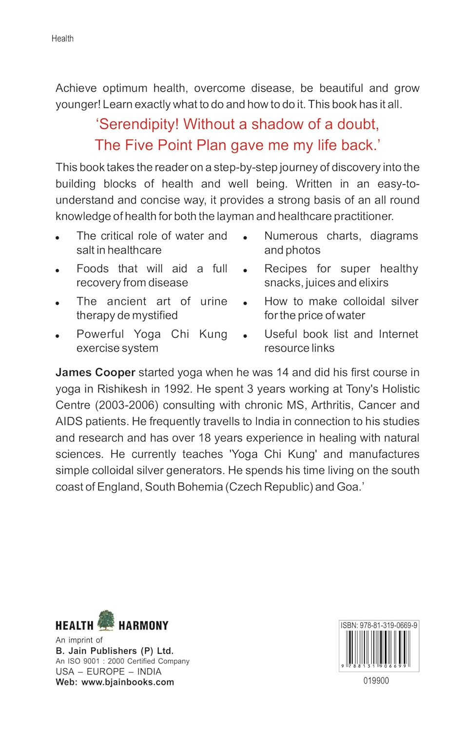 Achieve optimum health, overcome disease, be beautiful and grow younger! Learn exactly what to do and how to do it. This book has it all. 'Serendipity! Without a shadow of a doubt, The Five Point Plan gave me my life back.' This book takes the reader on a step-by-step journey of discovery into the building blocks of health and well being. Written in an easy-to understand and concise way, it provides a strong basis of an all round knowledge of health for both the layman and healthcare practitioner. • The critical role of water and salt in healthcare. • Foods that will aid a full recovery from disease. • The ancient art of urine therapy de mystified. • Powerful Yoga Chi Kung exercise system. • Numerous charts, diagrams and photos. • Recipes for super healthy snacks, juices and elixirs. • How to make colloidal silver for the price of water.