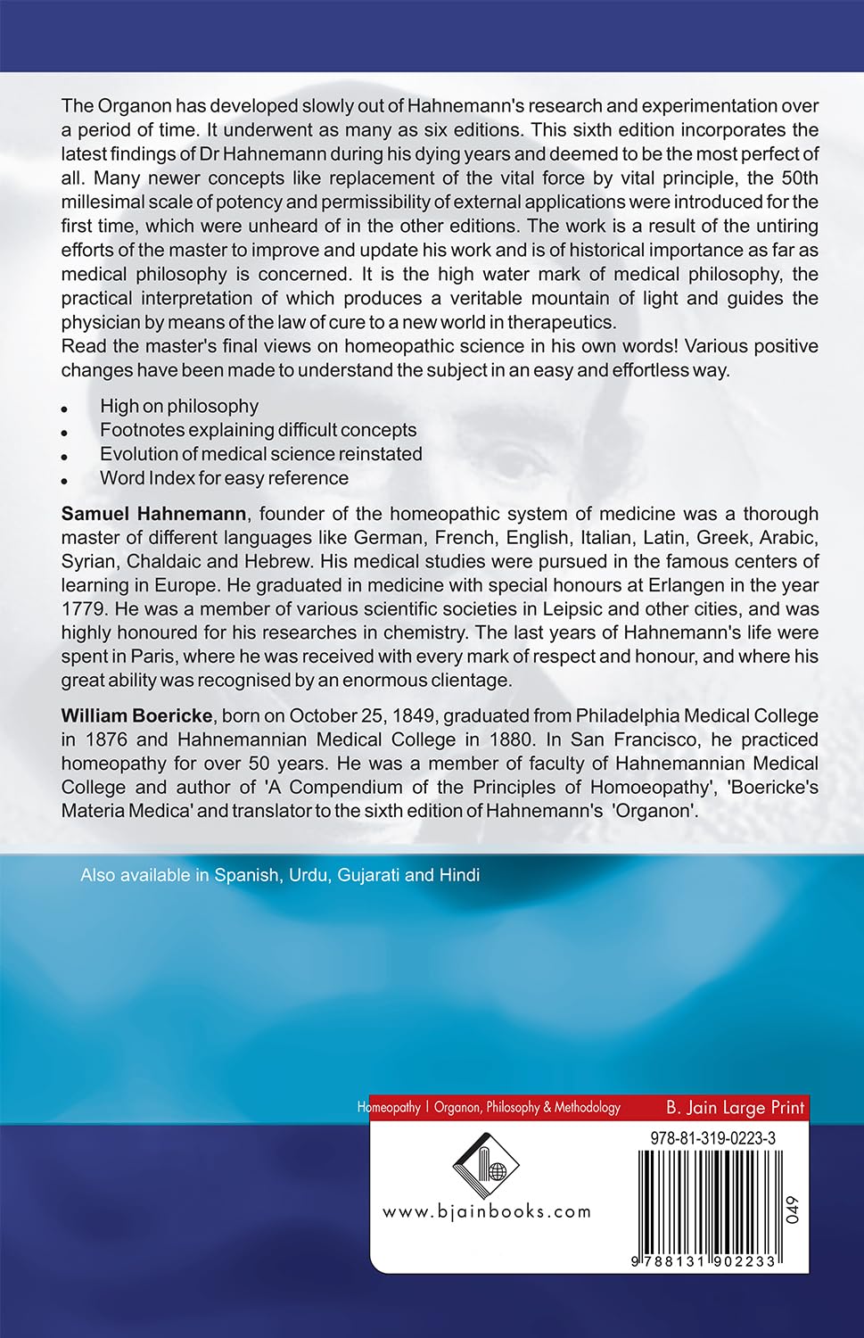 The Organon has developed slowly out of Hahnemann's research and experimentation over a period of time. It underwent as many as six editions. This sixth edition incorporates the latest findings of Dr Hahnemann during his dying years and is deemed to be the most perfect of all. Many newer concepts like the replacement of the vital force by vital principle, the 50th millesimal scale of potency, and the permissibility of external applications were introduced for the first time, which were unheard of in the other editions. The work is a result of the untiring efforts of the master to improve and update his work and is of historical importance as far as medical philosophy is concerned. It is the high water mark of medical philosophy, the practical interpretation of which produces a veritable mountain of light and guides the physician by means of the law of cure to a new world in therapeutics.