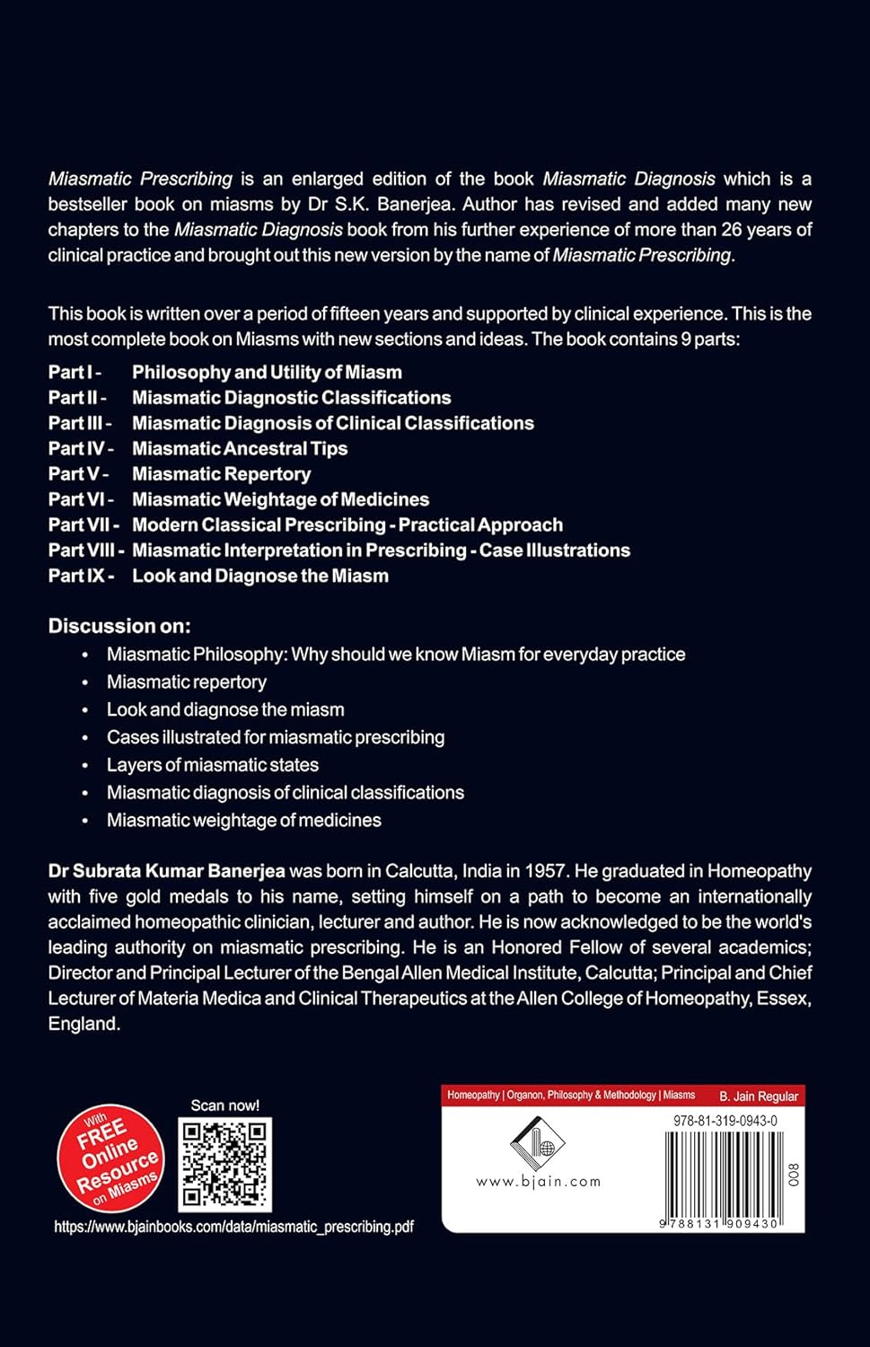 Miasmatic Prescribing is the much enlarged edition of the book Miasmatic Diagnosis which is a bestseller book on miasms by Dr S.K. Banerjea. Author has revised and added many new chapters to the Miasmatic Diagnosis book from his further experience of more than 26 years of clinical practice and brought out this new version by the name of Miasmatic Prescribing. This book is written over a period of fifteen years and supported by clinical experience.