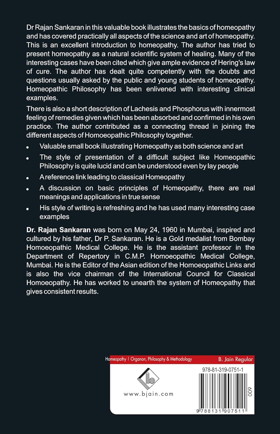 - Valuable small book illustrating Homeopathy as both science and art The style of presentation of a difficult subject like Homeopathic Philosophy is quite lucid and can be understood even by lay people.