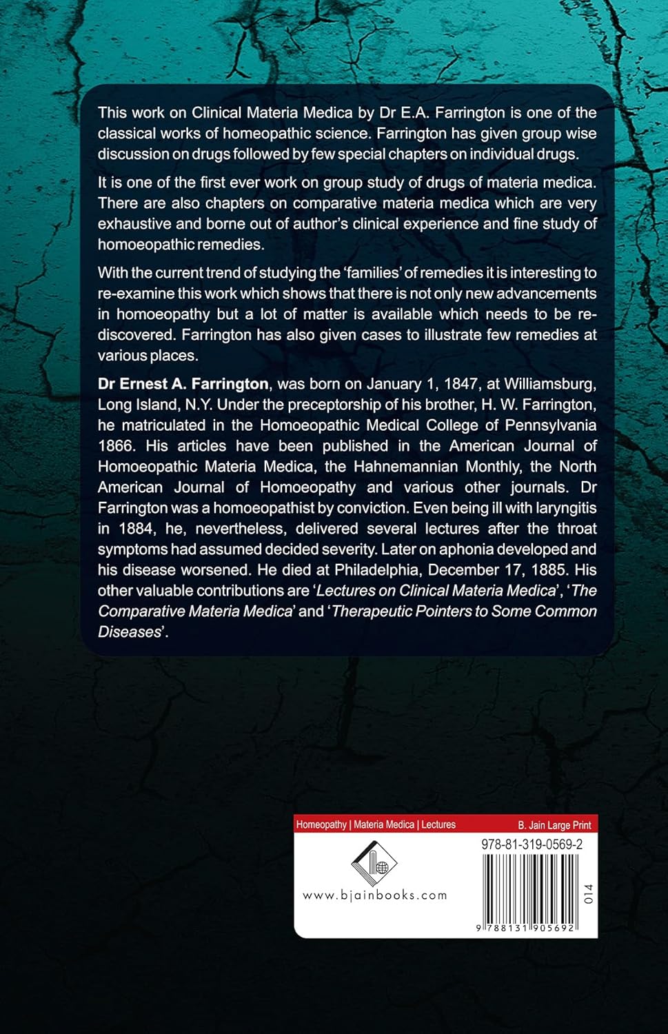 Dr Ernest A. Farrington matriculated from the Homoeopathic Medical College of Pennsylvania in 1866. His articles have been published in the American Journal of Homoeopathic Materia Medica, the Hahnemannian Monthly, the North American Journal of Homoeopathy and various other journals. Dr Farrington was a homoeopathist by conviction, his other valuable contributions are 'Lectures on Clinical Materia Medica', 'The Comparative Materia Medica' and 'Therapeutic Pointers to Some Common Diseases'.