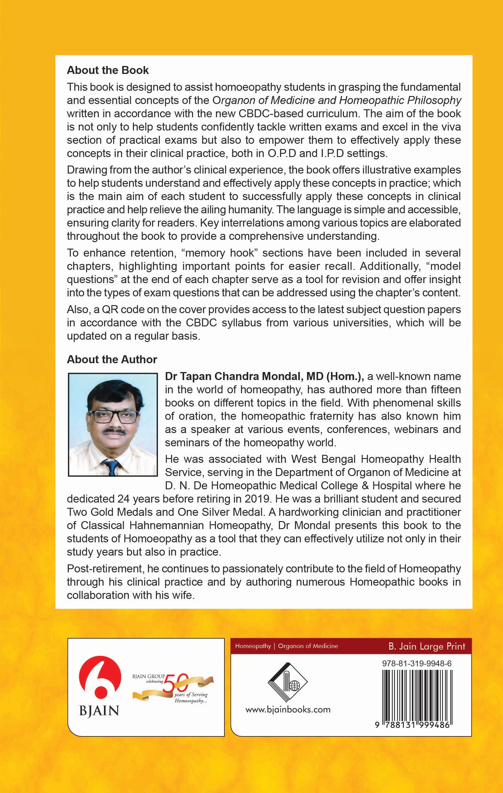 This book has been revised and expanded in accordance with the new CBDC-based curriculum. It is designed to assist homoeopathy students in grasping the fundamental and essential concepts of the Organon of Medicine and Homeopathic Philosophy. The aim of the book is not only to help students confidently tackle written exams and excel in the viva section of practical exams but also to empower them to effectively apply these concepts in their clinical practice, both in O.P.D and I.P.D settings. Drawing from the author’s clinical experience, the book offers illustrative examples to help students understand and effectively apply these concepts in practice, which is the main aim of each student to successfully apply these concepts in clinical practice and help relieve the ailing humanity.