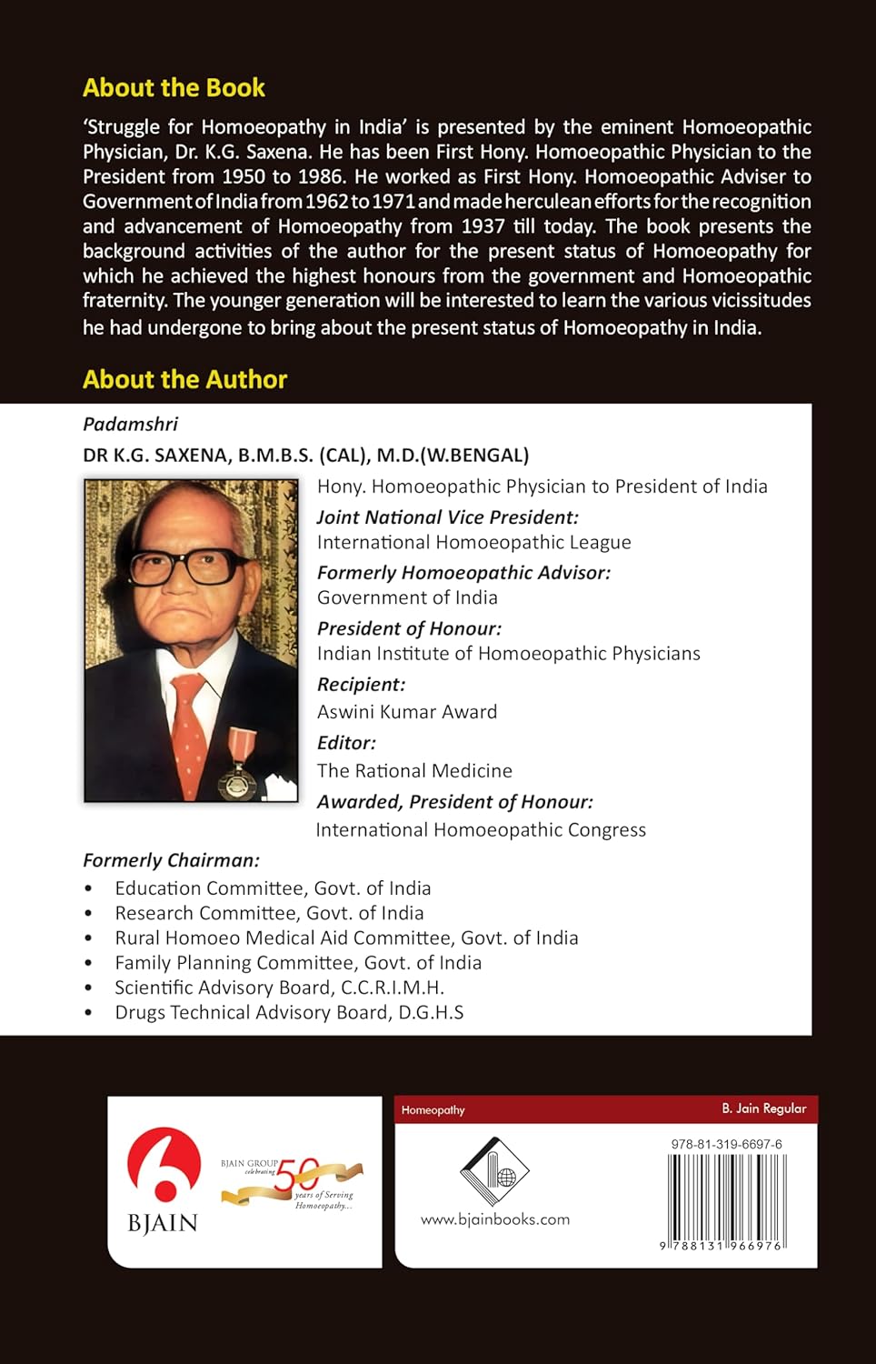 Authored by Padma Shri Late Dr K. G. Saxena, the first honorary advisor to the Govt. of India and the first honorary physician to Dr Rajendra Prasad, the first president of independent India, this book is a factual narration of the behind the curtain attempts and activities that formed the background of the current status of homoeopathy in India.