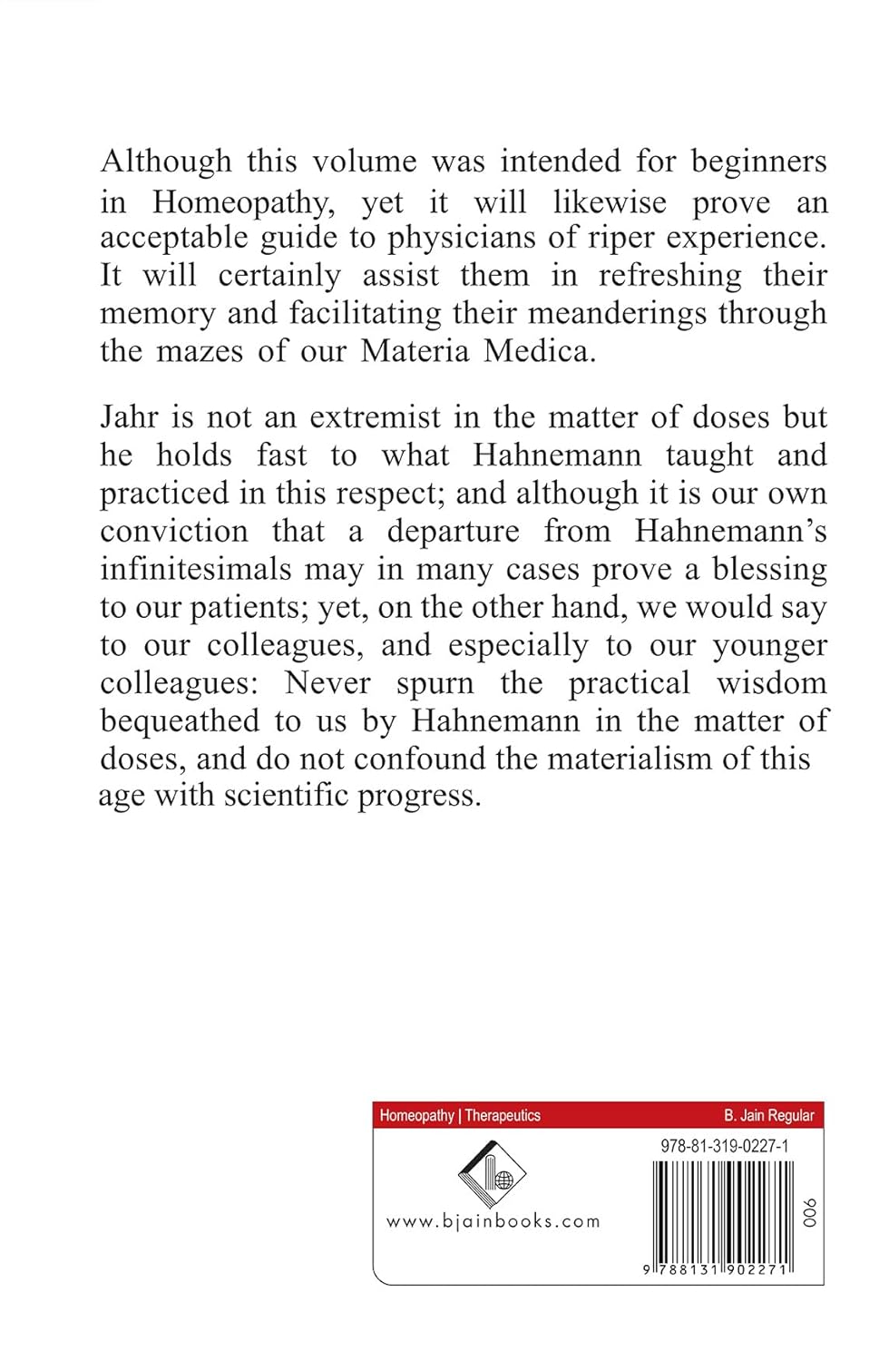 This masterpiece by Dr. Jahr includes personal observations regarding truly reliable and practically verified curative indications of acute cases. Although this volume was intended for beginners in Homeopathy, yet it will likewise prove an acceptable guide to physicians of riper experience. It will certainly assist them in refreshing their memory and facilitating their meanderings through the mazes of our Materia Medica.