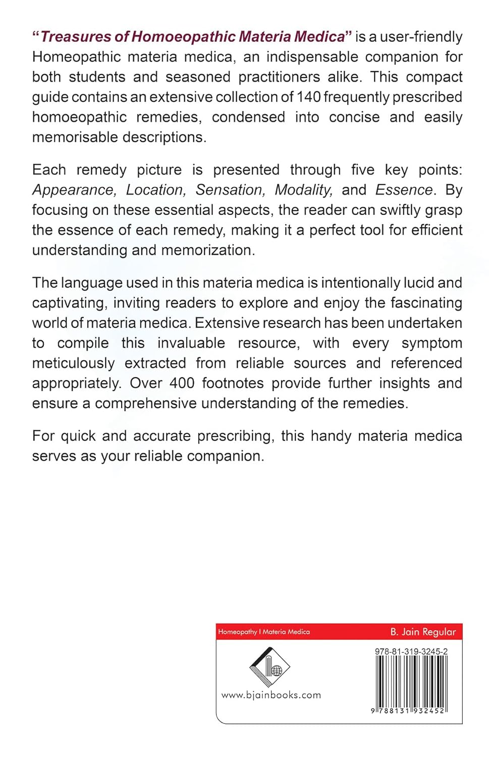 - Explore key aspects of medicines- Homoeopathy is generally based on prescribing on complete symptoms. Here in this book, each medicine has been described under the 5 key headings- appearance, location, sensation, modality, essence.